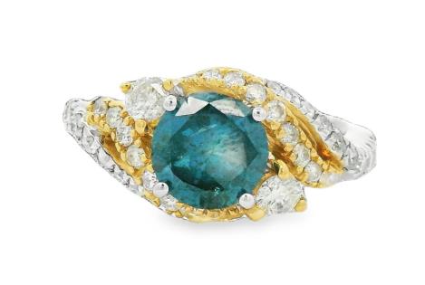 A 14CT WHITE GOLD WITH YELLOW GOLD BLUE AND WHITE DIAMOND SET SOLITAIRE DRESS RING, SIZE L1/2, 3.9G