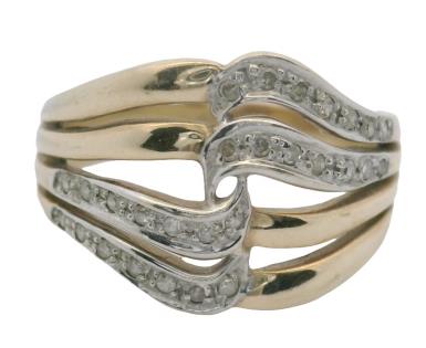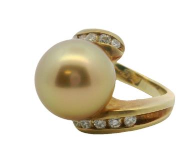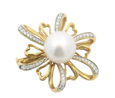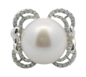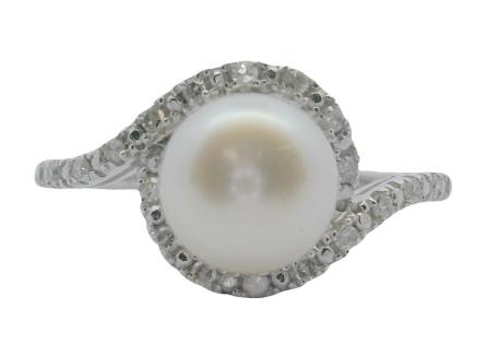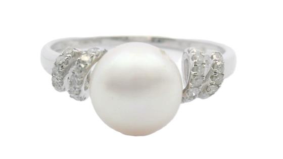 A 9CT WHITE GOLD BUTTON SHAPE PEARL & DIAMOND SET RIBBON SHOULDER RING, SIZE N. T.W. 1.9GRAMS