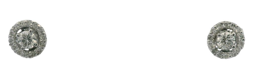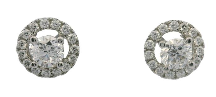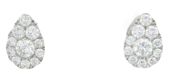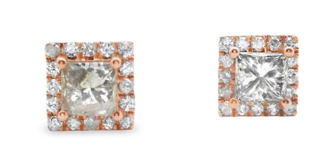 A 14CT ROSE GOLD PAIR OF 0.94CTS PRINCESS CUT DIAMOND & 0.23CTS DIAMOND CLUSTER STUDS, T.W. 2GRAMS