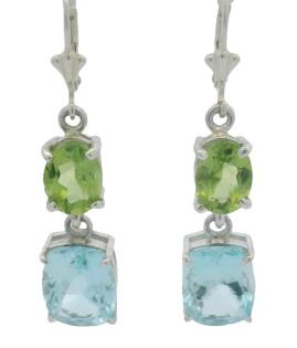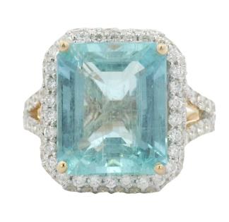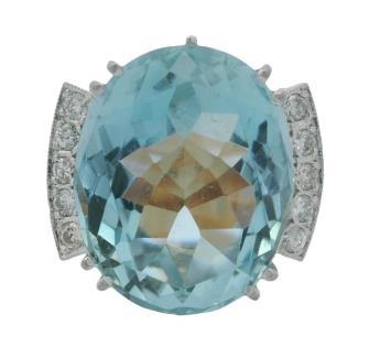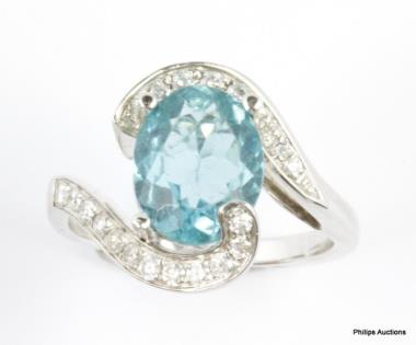 A 14CT WHITE GO AQUA TEAL BLUE APATITE & 2.50CTS DIAMOND SWIRLED DRESS RING, SIZE N. T.W. 5.5GRAMS
