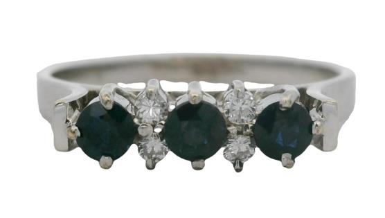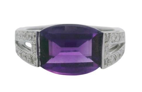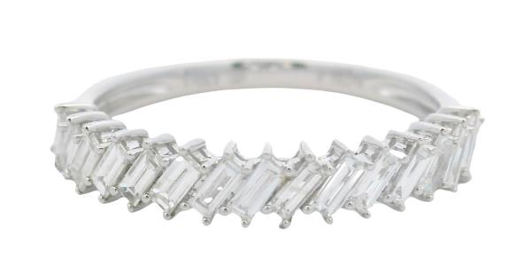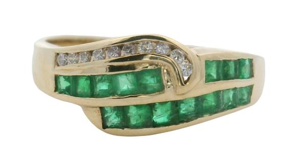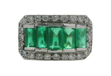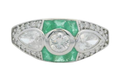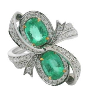 A 14K W.G VERTICAL LINE OVAL CUT EMERALDS(1.14CT) & DIAMOND(0.56CT) BOW RING, SIZE: N1/2, T.W.: 4.8G