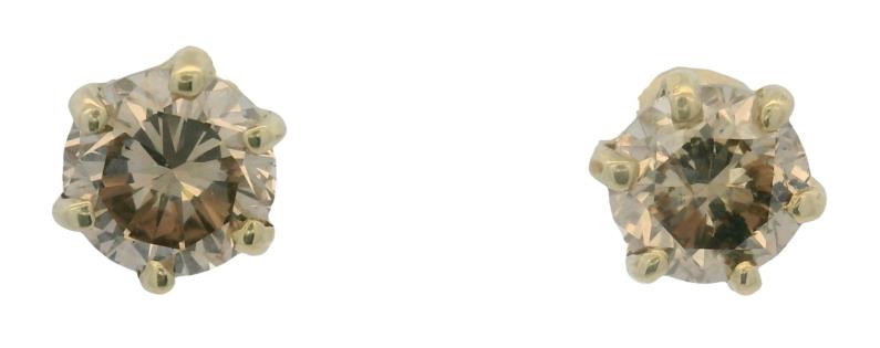 A PAIR OF 18CT Y.G SOLITAIRE CHAMPAGNE COLOUR DIAMOND STUDS TOTALLING 2.04CT, WEIGHING 2.2GRAMS
