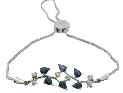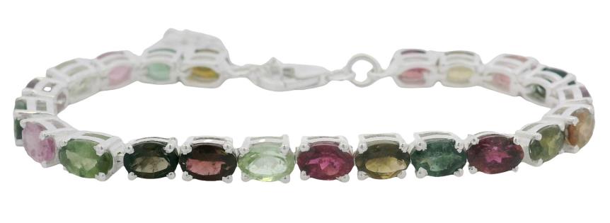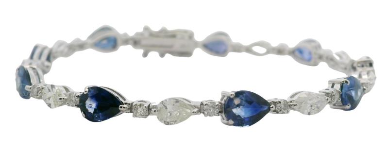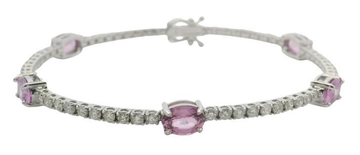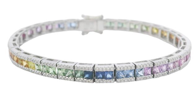 AN 18K W.G MULTI COLOURED SAPPHIRE(7.27CT) & DIAMOND(.86CT) EDGED LINE B'LET, L: 18CM, T.W.: 20.4G