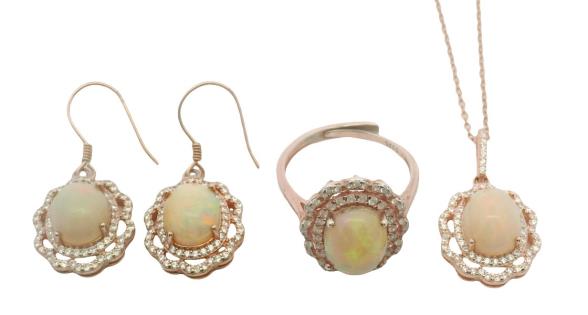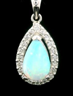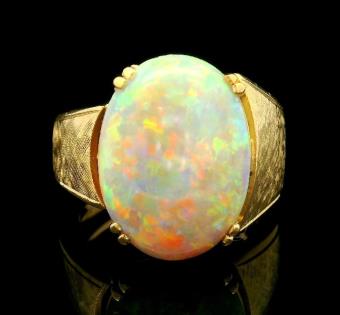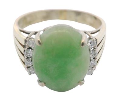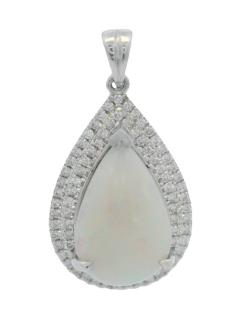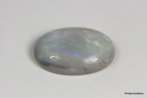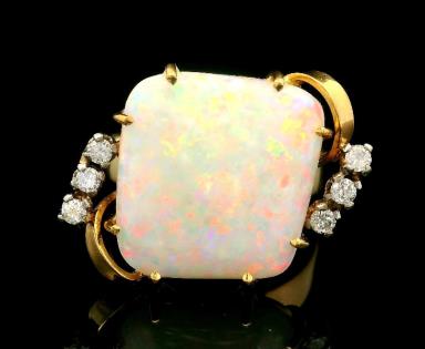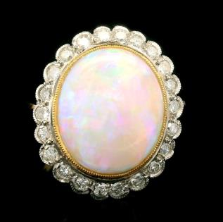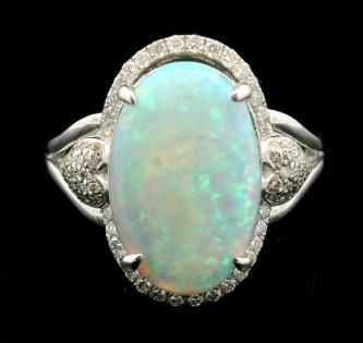 AN 18K W.G OVAL CUT CABOCHON WHITE OPAL & DIAMOND DETAILED RING, SIZE: N1/2, T.W.: 4.6GRAMS