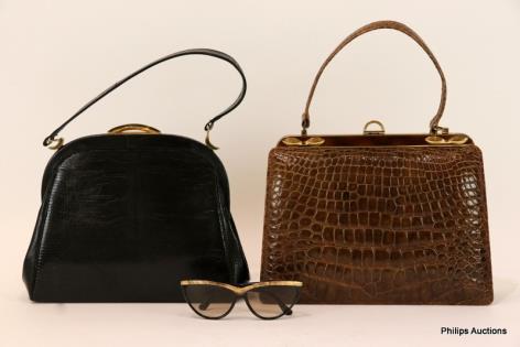 VINTAGE ITEMS: TWO EXOTIC LEATHER HANDBAGS & A PAIR OF SUNGLASSES