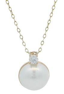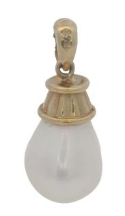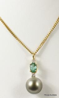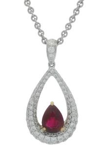 AN 18K Y.G MODERN TAHITIAN PEARL, RUBY OF 1.30CT & DIAMOND PENDANT ON CHAIN, L: 44CMS, T.W.: 14.5G
