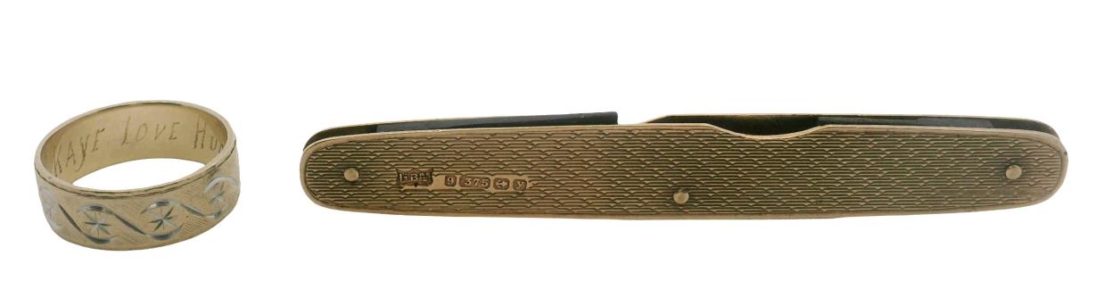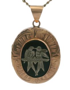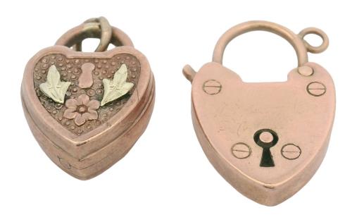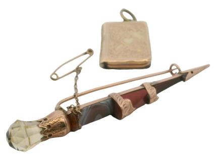 A 9CT ROSE GOLD SCOTTISH HARDSTONE DIRK AND GOLD FRONT AND BACK LOCKET, T.W. 16GRAMS