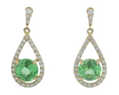 AN 18CT YELLOW GOLD PAIR OF ROUND CUT GARNETS & FLOATING PEAR CUT FRAME SHORT DROP EARRINGS, 3.7G
