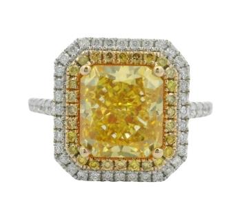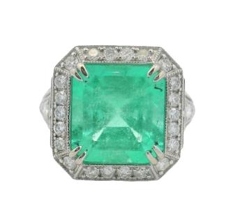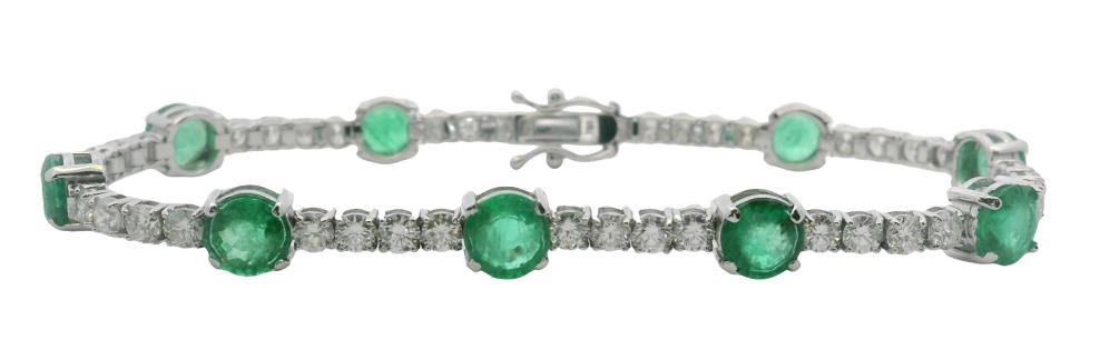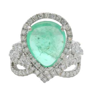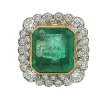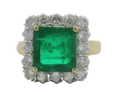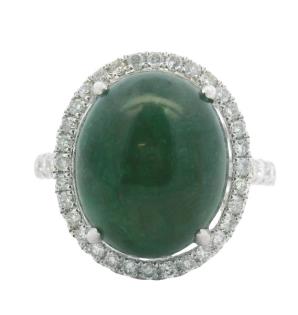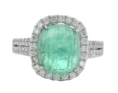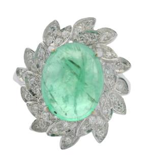 AN 18K Y/W GOLD OVAL CUT EMERALD OF 4.90CT & DIAMOND(.65CTA) HALO RING, SIZE: O1/2, T.W.: 9.0GRAMS