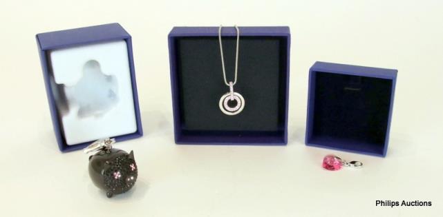 A SWARVOSKI PENDANT NECKLACE, KEY RING and DROP PENDANT