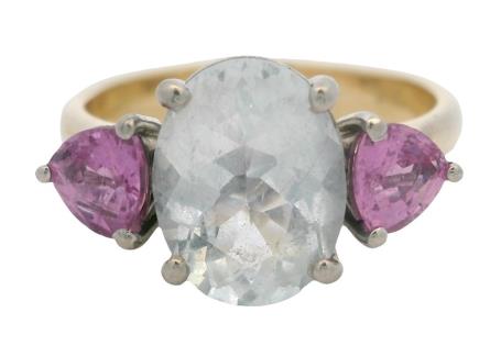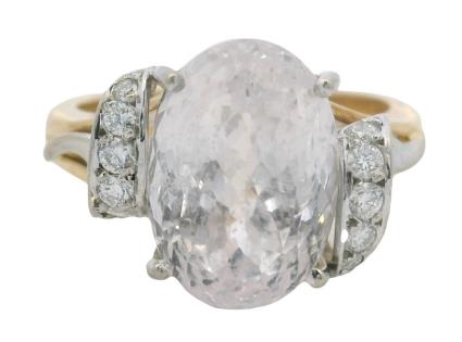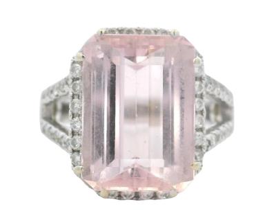 A PALE PEACH PINK KUNZITE & DIAMOND DETAILED 18CT YELLOW & WHITE GOLD DRESS RING SIZE Q1/2, 9GR *SRN