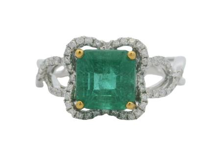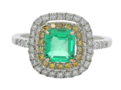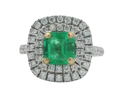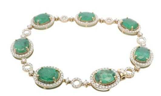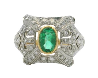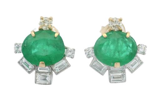 A PAIR 18CT WHITE & YELLOW GOLD ART DECO STYLE OVAL CUT EMERALD & MULTI DIAMOND STUDS, 5.9GR