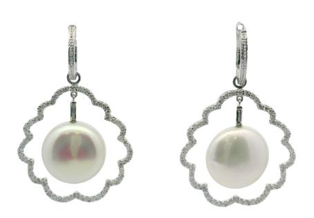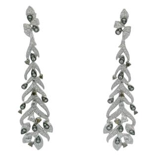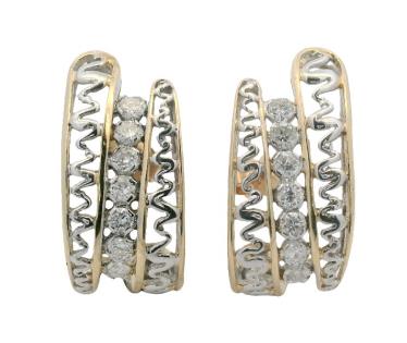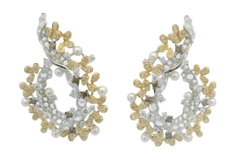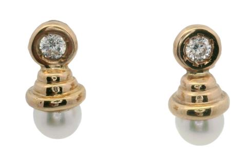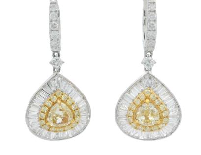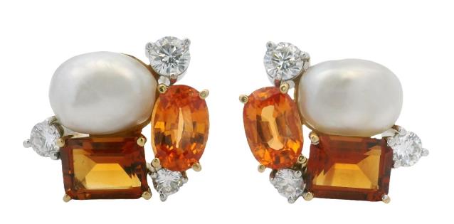 A PAIR OF 18CT YELLOW AND WHITE GOLD 'C' SHAPED PEARL, DIAMOND & YELLOW DIAMOND EARRINGS, 18.5GR