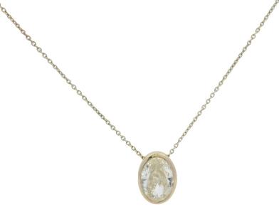 A 14CT YELLOW GOLD SOLITAIRE FANCY YELLOW OVAL CUT 1.71CT DIAMOND PENDANT ON CHAIN, 2.6GR