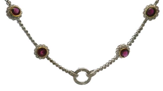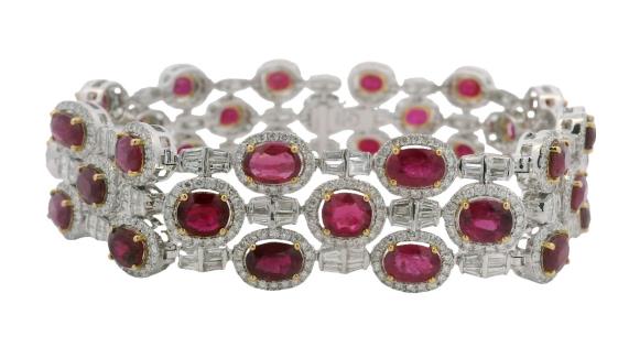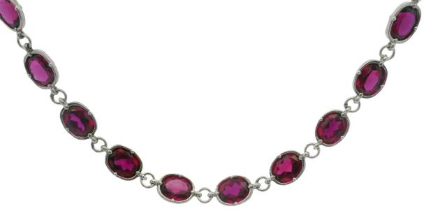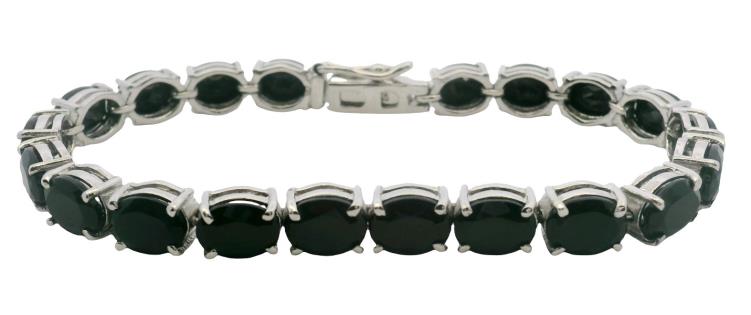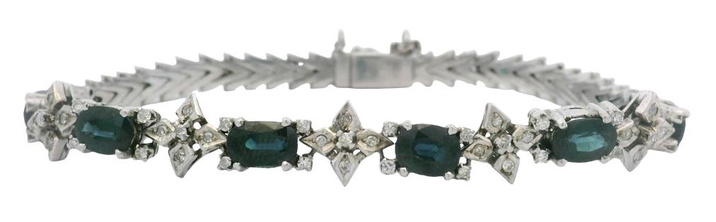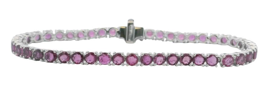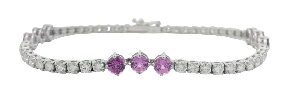 A 14CT WHITE GOLD ROUND CUT PINK SAPPHIRE & DIAMOND LINE BRACELET, 7.4GR