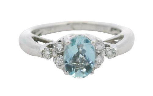 A 14CT WHITE GOLD OVAL CUT AQUAMARINE & FLANKED DIAMOND CLUSTER RING SIZE N1/2, 4.7GR