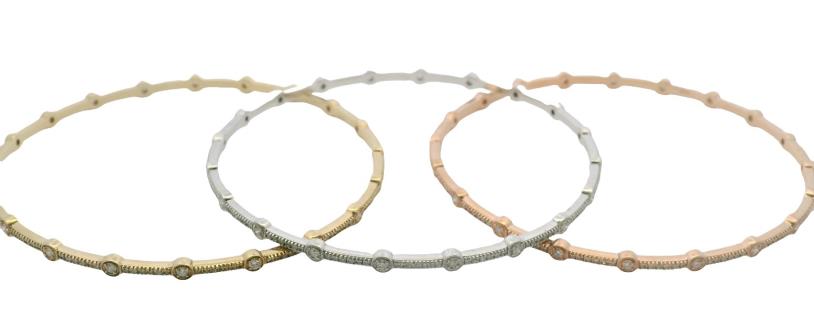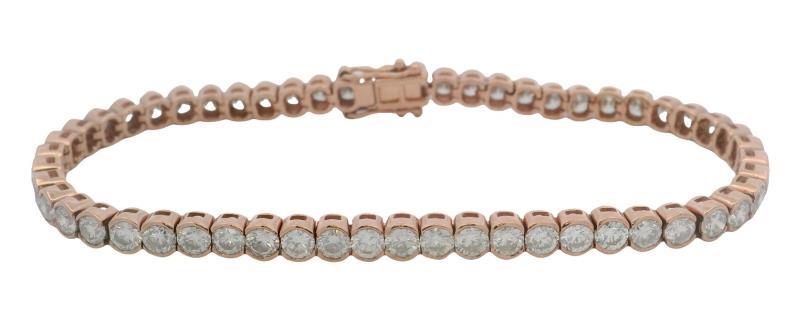 A 14CT ROSE GOLD ROUND CUT 6.67CTS DIAMOND BEZEL SET TENNIS BRACELET, 12.3GR