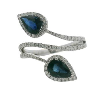 A 14CT WHITE GOLD BYPASS PEAR CUT SAPPHIRE & DIAMOND DETAILED WRAP RING SIZE N1/2, 3.5GR