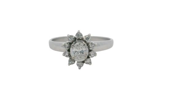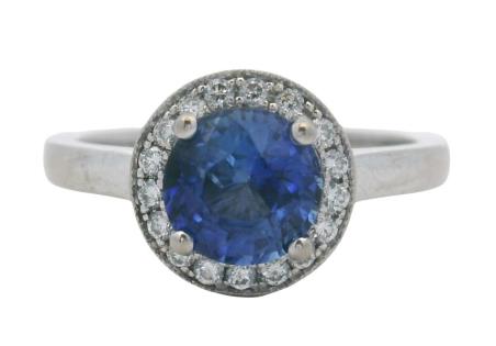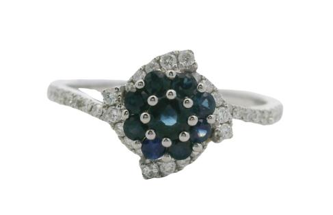 A 14CT WHITE GOLD ROUND CUT SAPPHIRE & DIAMOND HALO FLORAL CLUSTER RING SIZE N1/2, 2.3GR