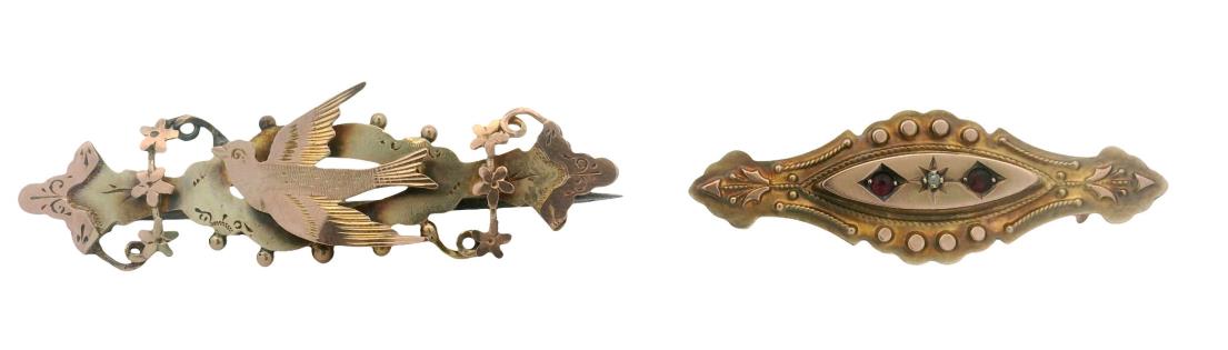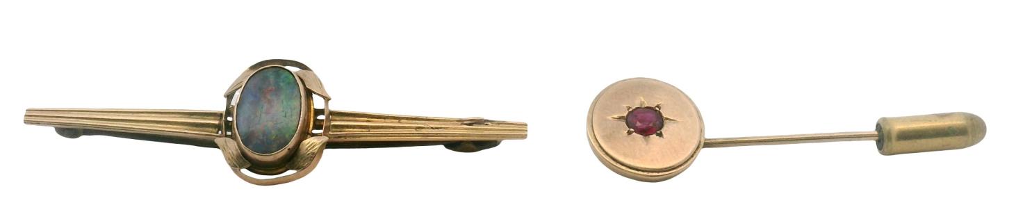 AN OPAL DOUBLET VINTAGE BAR BROOCH AND GARNET SET STICKPIN, BOTH 9CT, 4.2GRAMS TOTAL