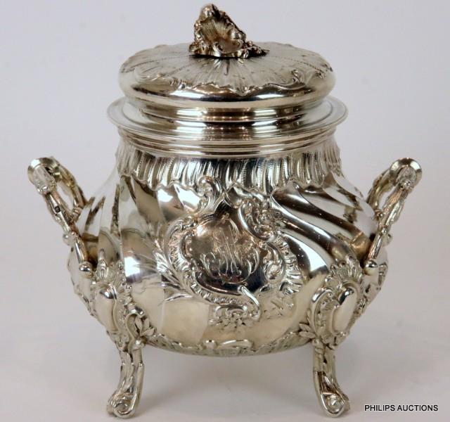 The generous squat form basin of rococo inspiration with a repoussé twist body with C-scroll cartouche engraved with initials ML, with acanthus leaf handles and scrolled attachments, raised on scroll feet, and slightly raised lid with a finely crafted foliate finial; marked to the underside and lid. Weight: 580g