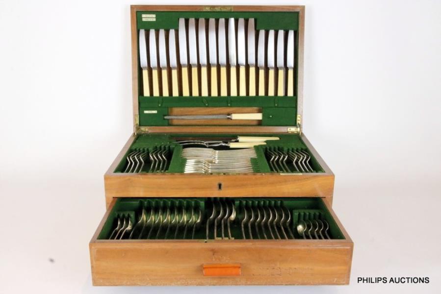 1935 London, with maker's mark R.W. Burbridge for Harrods. The complete service for eight settings, comprising 8 table forks, soup spoons, fish knives, fish forks, dessert forks, teaspoons, 4 table spoons, 2 sauce ladles, each marked, plus 8 bone handled table and cheese knives with stainless blades and carving set, in green velvet lined walnut canteen, with retailer's plaque 'Harrods Ltd, Silversmiths & Cutlers, London'. Silver weight: 3055g.