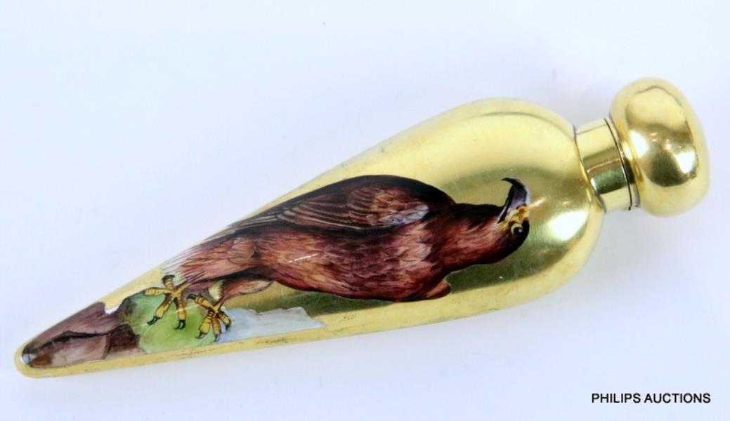 The fine scent bottle and hinged cover of tapering teardrop form, decorated to the front with an eagle on the edge of a cliff, with engraved monogram to the reverse, the interior also silver-gilt, marked to the body. Weight: 42g