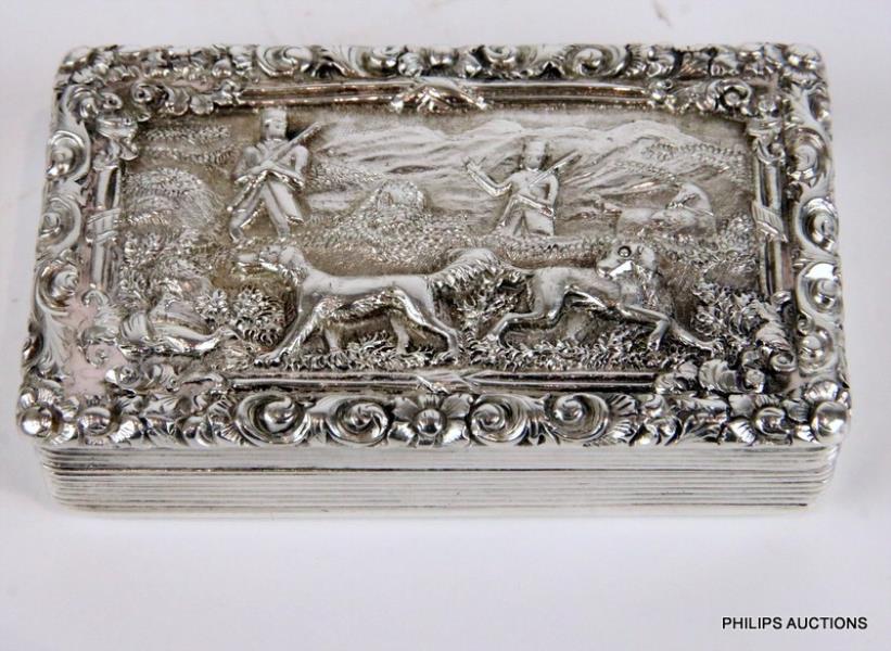 The cast top table snuff with a crisply decorated hunting scene in high relief, bordered by a cast foliate edge, by a specialist box maker of the period, with original crest to a rectangular cartouche to the underside surrounded by engine turned decoration, marked twice to the gilt interior.