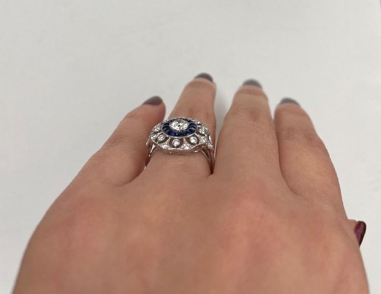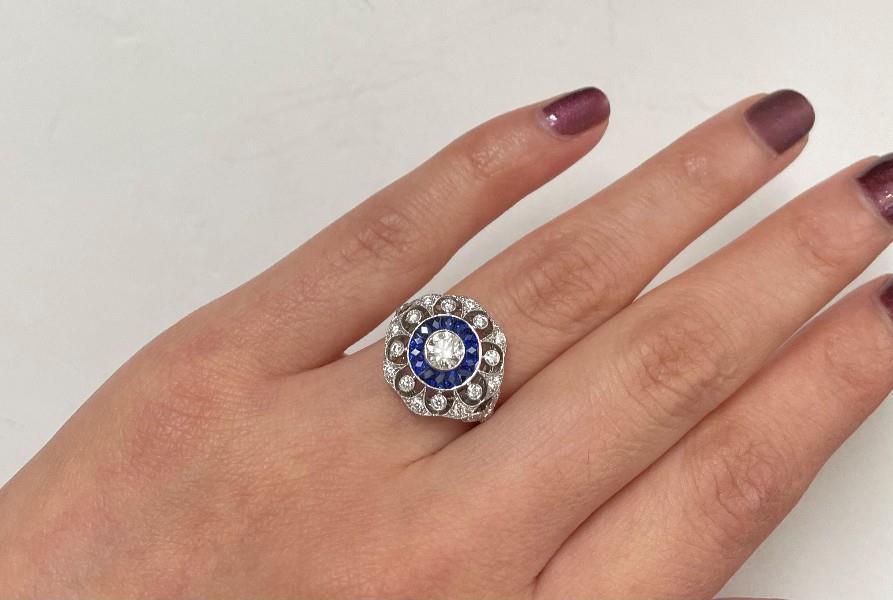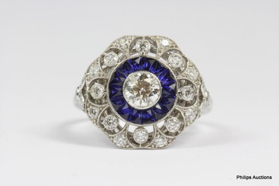 18ct white gold, of rounded octagonal shape, Art Deco styled, centrally detailed by a single brilliant cut diamond of approximately 0.34ct, millgrain bezel set within a frame of calibree cut sapphires, strong blue in colour, framed by a pierced scalloped surround of further diamonds, stepping out to split diamond set shoulders and fine band. A.T.D.W.: 0.64ct. Valuation on request. Ring Size J.