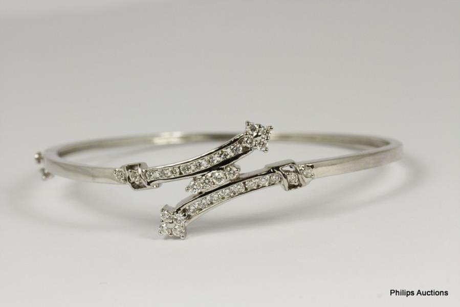 18ct white gold, made as a modern oval/rounded shaped hinged bangle, detailed to top panel with two intersecting open ended rails of channel set brilliant cut diamonds, each terminating with an Arrow style motif also diamond set, connected by a small diamond set rail, capped and merging to a smooth polished band with hinged clasp and safety catch. Inner Width: 5.7cm