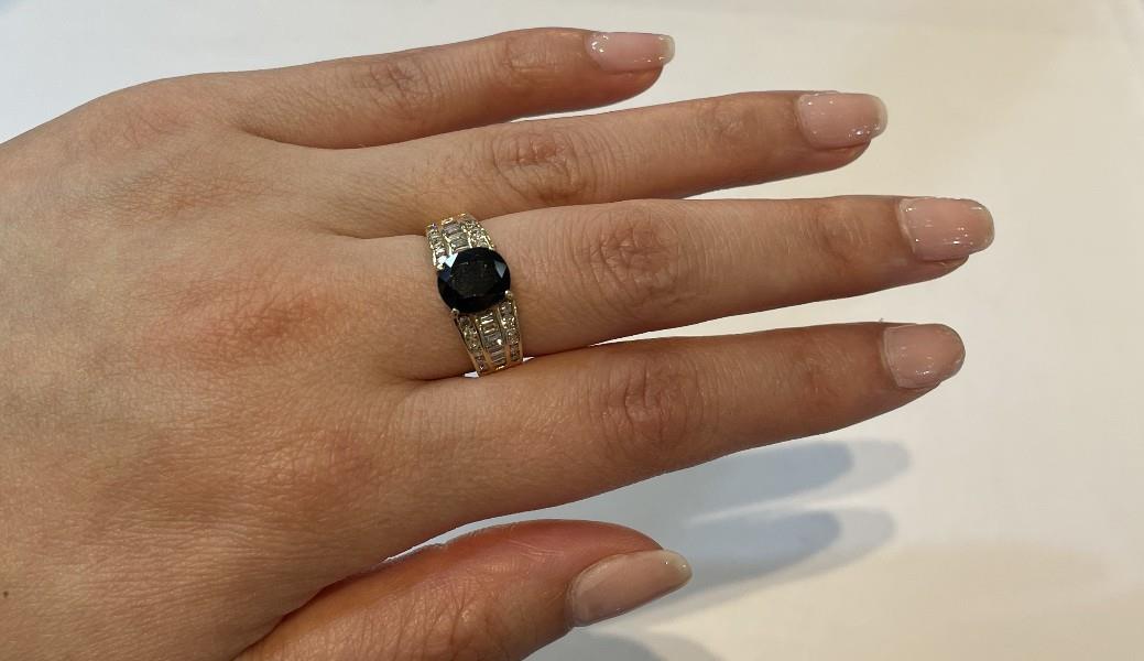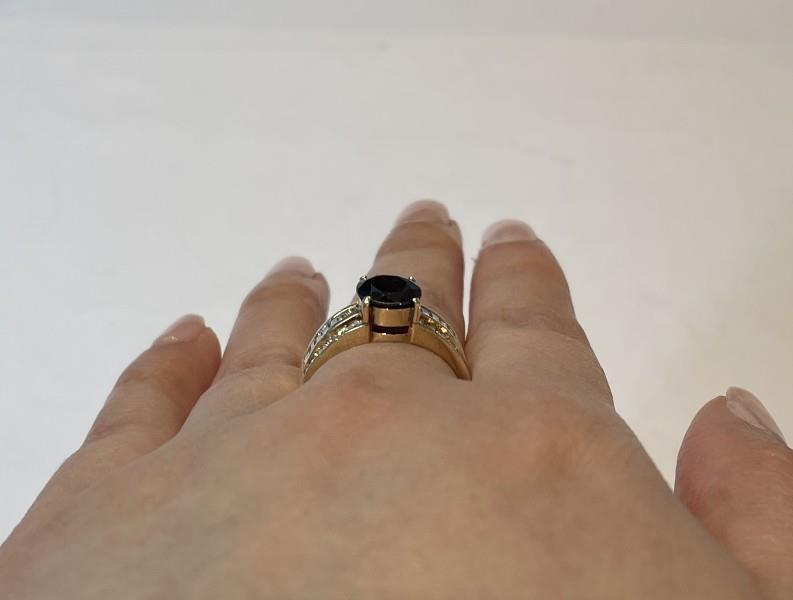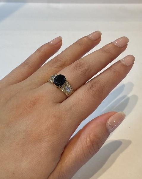 14ct white gold, stamped 14k, modern panel solitaire dress ring, featuring a central oval sapphire of deep blue colour, weighing approximately 1.70ct, claw set in four bead claws, set slightly raised against the wide diamond set band, triple row design, set with baguette cut diamonds to centre and flanked by finer rows of smaller brilliant cuts, channel set throughout, merging to a smooth wide band, totalling approximately 0.64ct. Ring Size N1/2. Total Weight: 5.7grams