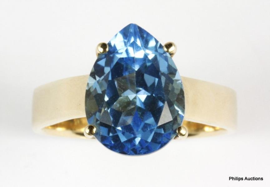 9ct yellow gold, presented as a large modern solitaire dress ring, featuring a central pear cut blue topaz of intense bright colour, weighing approximately 10.00cts, claw set and set to a smooth upswept ring of large size with band width to reverse of 5mm. Ring Size Z +2 Total Weight: 10.8grams