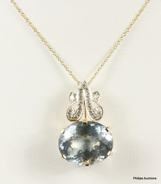AN OVAL CUT AQUAMARINE OF 23.18CT & DIAMOND 0.57CT DETAILED 14CT YELLOW GOLD PENDANT ON CHAIN