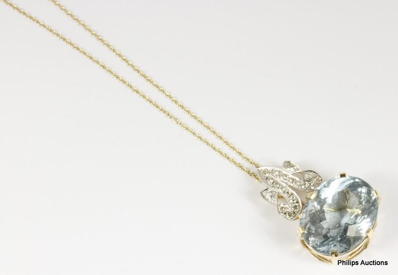 14ct yellow gold, featuring an oval cut Aquamarine, totalling 23.18ct, claw set on its side, on a decorative basket, set above featured is a letter A frame, set with nineteen round brilliant cut Diamonds, totalling 0.57ct, micro claw set with millegrain edging in white gold, concealed bail, presented on a fine, yellow gold, belcher link chain. Height of pendant: 3.3cm. Length of chain: 54cm. Total weight: 9.7g