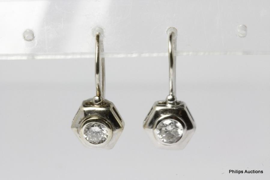 9ct white gold, presented as short fixed drop earrings of solitaire design, each set with a single brilliant cut diamond of approximately 0.36ct, flush bezel set within a polished hexagonal shaped white gold frame of polished gold with pierced gallery detail, connecting to fixed pierced European fittings. Length: 2cms Valuation on request.