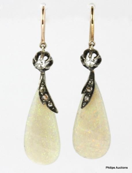 A PAIR OF 18CT YELLOW GOLD ANDS SILVER ANTIQUE STYLED SOLID LIGHTNING RIDGE OPAL DROPS