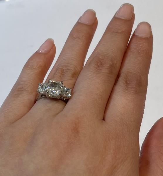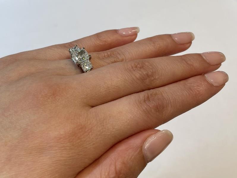 AN IMPRESSIVE THREE STONE CUSHION CUT DIAMOND PLATINUM RING TOTALLING 3.13CTS