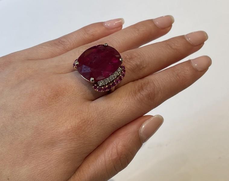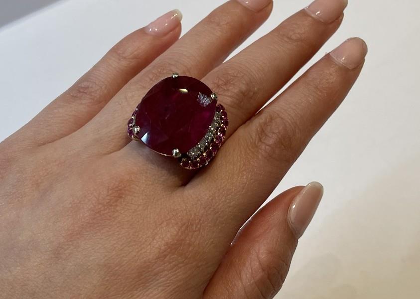 Palladium and 18ct rose gold, featuring a large oval cut Mozambique Ruby, totalling 26.62ct, claw set, displaying medium vibrant pinky red tones, flanked by curved panels of ten round brilliant cut Diamonds, totalling 0.75ct, claw set in palladium, and further enclosed by another two curved panels of twenty round cut pink Sapphires, totalling 0.90ct, claw set in rose gold, extending towards the back, before merging into a polished, flat band. Ring size: L. Valuation and origin report on request. Total weight: 14.9g