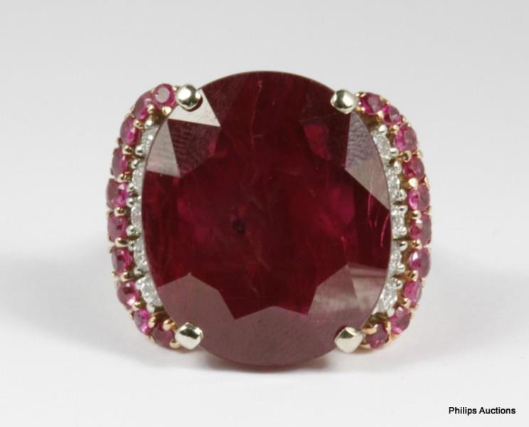 A LARGE RUBY TOTALLING 26.62CT, DIAMOND 0.75CT & PINK SAPPHIRE CLUSTER 0.90CT SET DRESS RING
