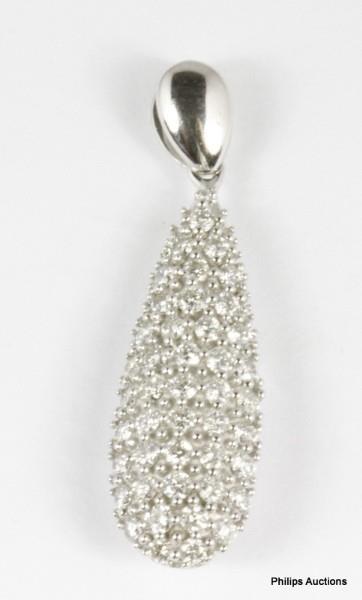 9ct white gold, modern, designed as a slender teardrop shaped pendant with slightly domed profile, pave set to front with brilliant cut diamonds of uniform size, totalling approximately 0.50ct, pierced to reverse and fitted with a small polished white gold bail. Length: 2.8cms A.T.D.W.: 0.50ct.