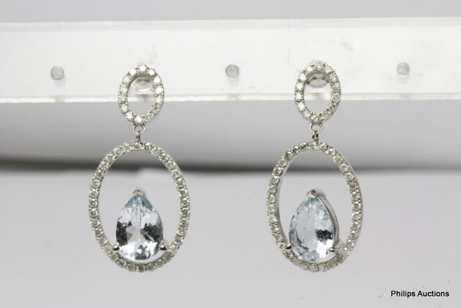 14ct white gold, featuring a pair of pear cut Aquamarines, totalling 3.11ct, claw set, basket setting, open back, sitting against bottom of a floating oval frame, set with round brilliant cut Diamonds, individually claw set and suspended from an articulated, smaller Diamond set oval frame, presented with pierced post. A.T.D.W.: 0.98ct. Height of earrings: 3.3cm. Valuation on request. Total weight: 5.0g