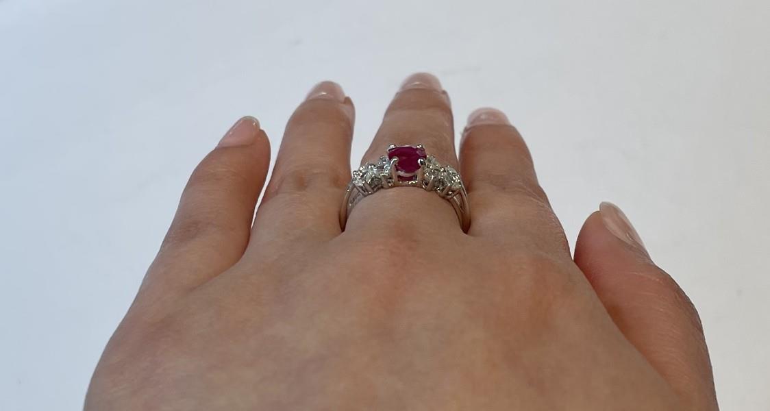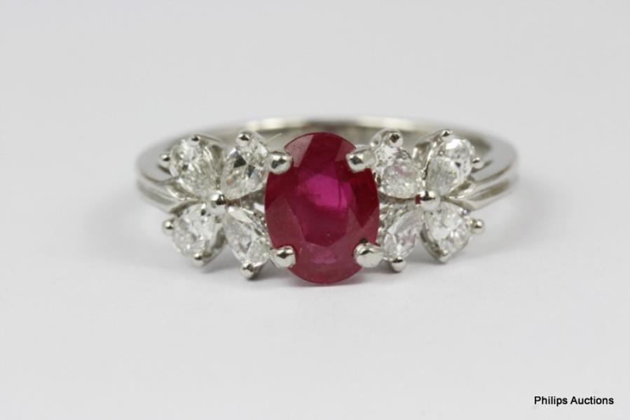 Platinum, featuring an oval cut Ruby displaying medium pinkish red, totalling approximately 1.21ct, claw set and flanked by eight tear shape Diamonds, arranged with the points towards a centre stud in a flower arrangement, set individually to the shoulders, merging into a featured groove band. Ring size: M. Total weight: 5.1g. Valuation on request