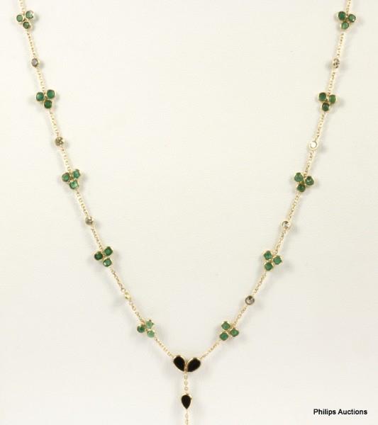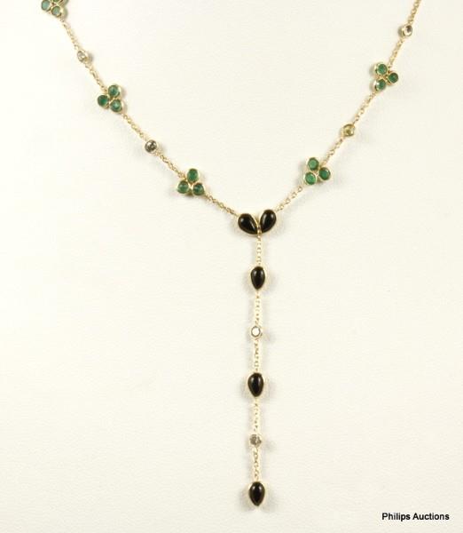 A MULTI-STONE EMERALD TOTALLING 2.66CT, DIAMOND 0.93CT & ONYX 1.59CT BY YARD LARIAT 18CT NECKLACE