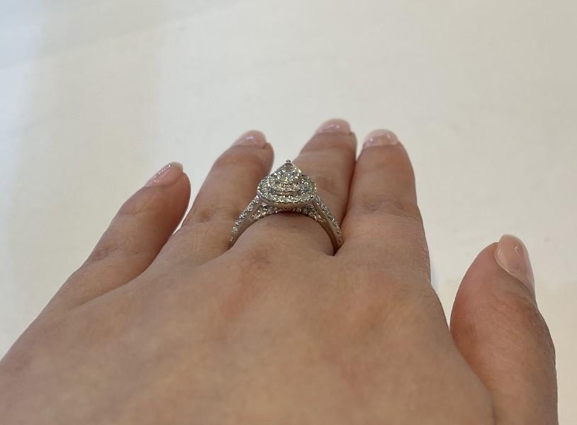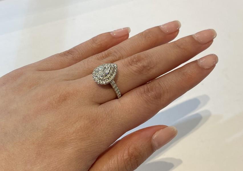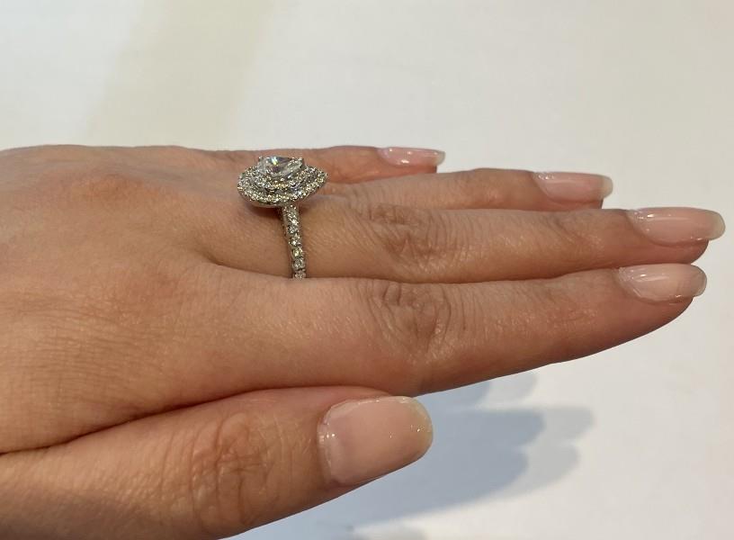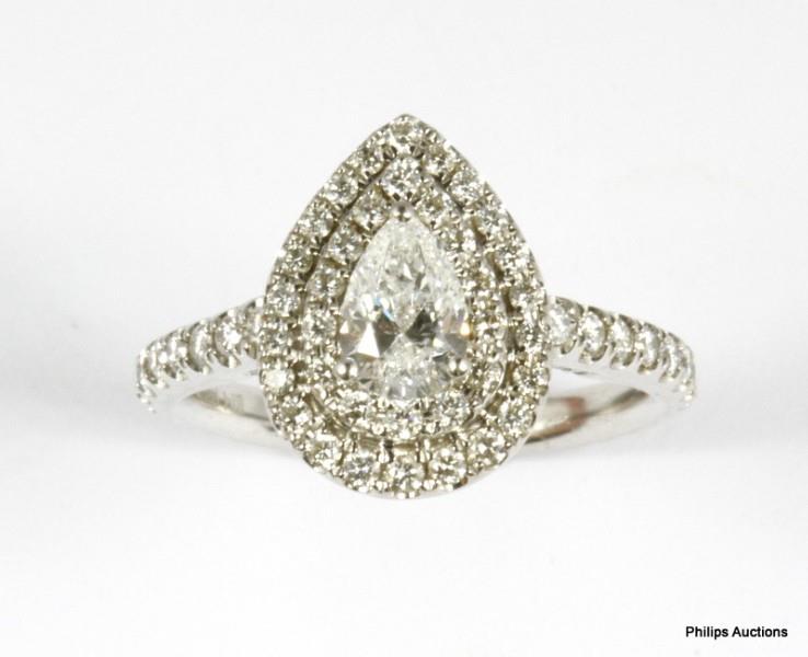 A 14CT WHITE GOLD MODERN PEAR SHAPED DIAMOND OF 0.40CT DOUBLE HALO DIAMOND CLUSTER RING