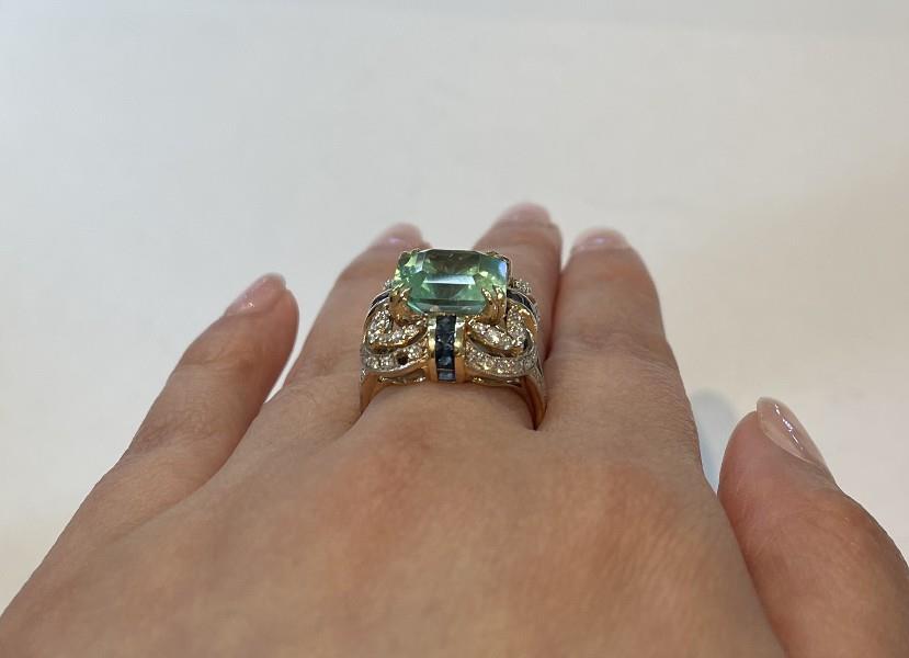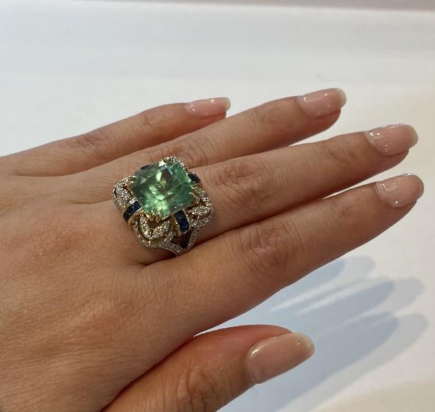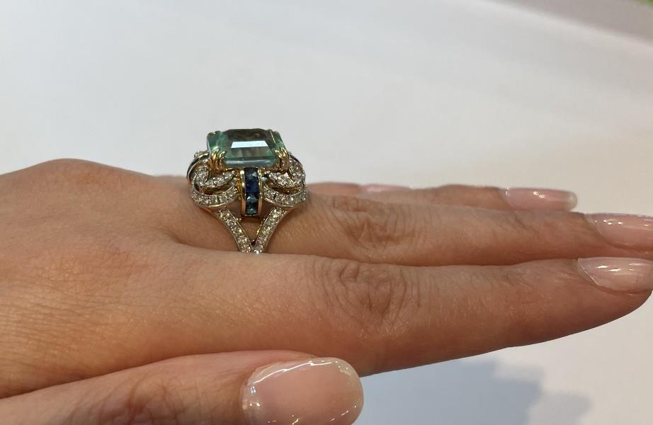 14ct yellow gold, featuring a centre emerald cut Emerald, totalling 8.04ct, double claw set, centred by sixteen square cut Sapphires, totalling 1.14ct, channel set at cross sections and curving to the dome mount, accompanied by eighty round brilliant cut Diamonds, set to the corners of the featured stone, arranged like floating petals, merging into Diamond set, split shoulders and into a flat, modern square band. A.T.D.W.: 0.83ct. Ring size: M. Total weight: 7.0g
