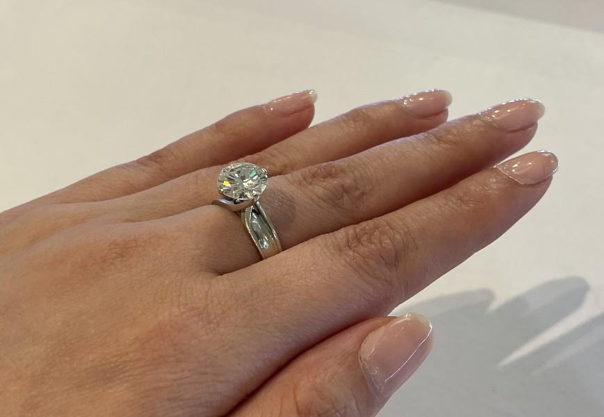 18ct white gold and palladium, stamped, crafted as a twisted four claw set solitaire ring, featuring a brilliant cut diamond of approximately 3.08ct, upswept and shouldered by a ribbed band with concave form, tapering to reverse. Ring Size M. N.B. central diamond as found.
