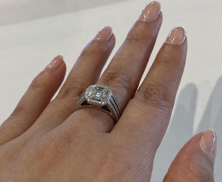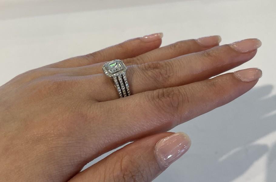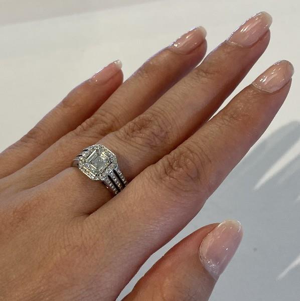 18ct white gold, handcrafted and hallmarked, presented as a smooth cut cornered rectangular shaped cluster, featuring a central fine quality emerald cut diamond of approximately 1.10ct, double claw set in four corners, framed by a smooth grain set frame of smaller brilliant cut diamonds, flanked by slopped triple railed shoulders diamond set merging to smooth band at reverse. Ring Size K. A.T.D.W.: 1.55ct. Purchase receipt available.