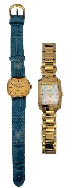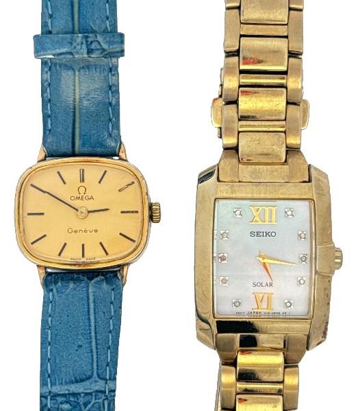 Yellow gold plated stainless steel case, the Omega Genève with quartz movement, of rectangular cushion shape, golden dial and baton markers, two hands, fitted to blue leather strap, the second a modern style, yellow gold coloured Seiko with quartz movement, rectangular curved case, mother-of-pearl dial, single cut diamond dot makers, two hands, fitted to a bracelet with fold over clasp.
