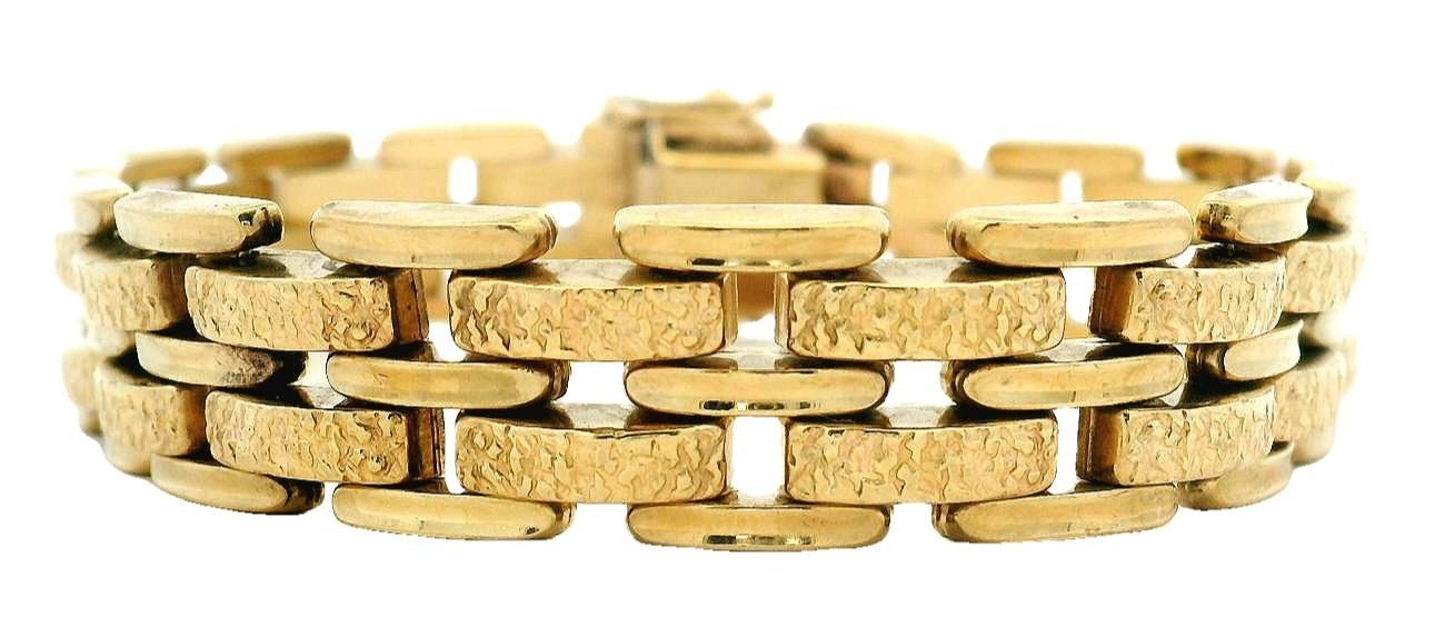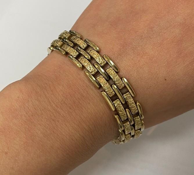 8ct yellow gold, stamped 333 German manufacture, presented as a gate link bracelet measuring 12mm in Width, with triple ribbed domed links alternating with double larger links each finished with a textured stippled finish, completed with a slide clasp and double safety catches. Length: 20.2cm