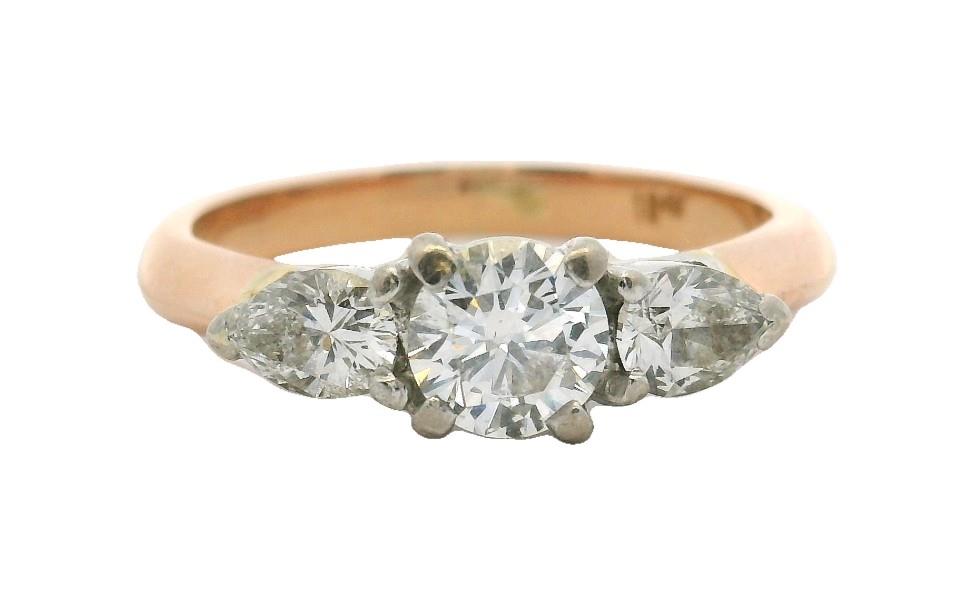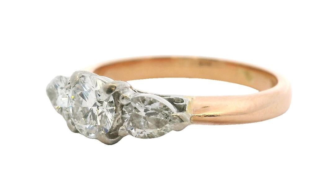 18ct rose and white gold, handcrafted, designed as a white gold claw set trilogy with central brilliant cut diamond of approximately 0.50ct, flanked to each side by a pear cut diamond, two totalling approximately 0.40ct, slightly angled, raised setting to allow for a straight band to sit against, merging to a rose gold band.